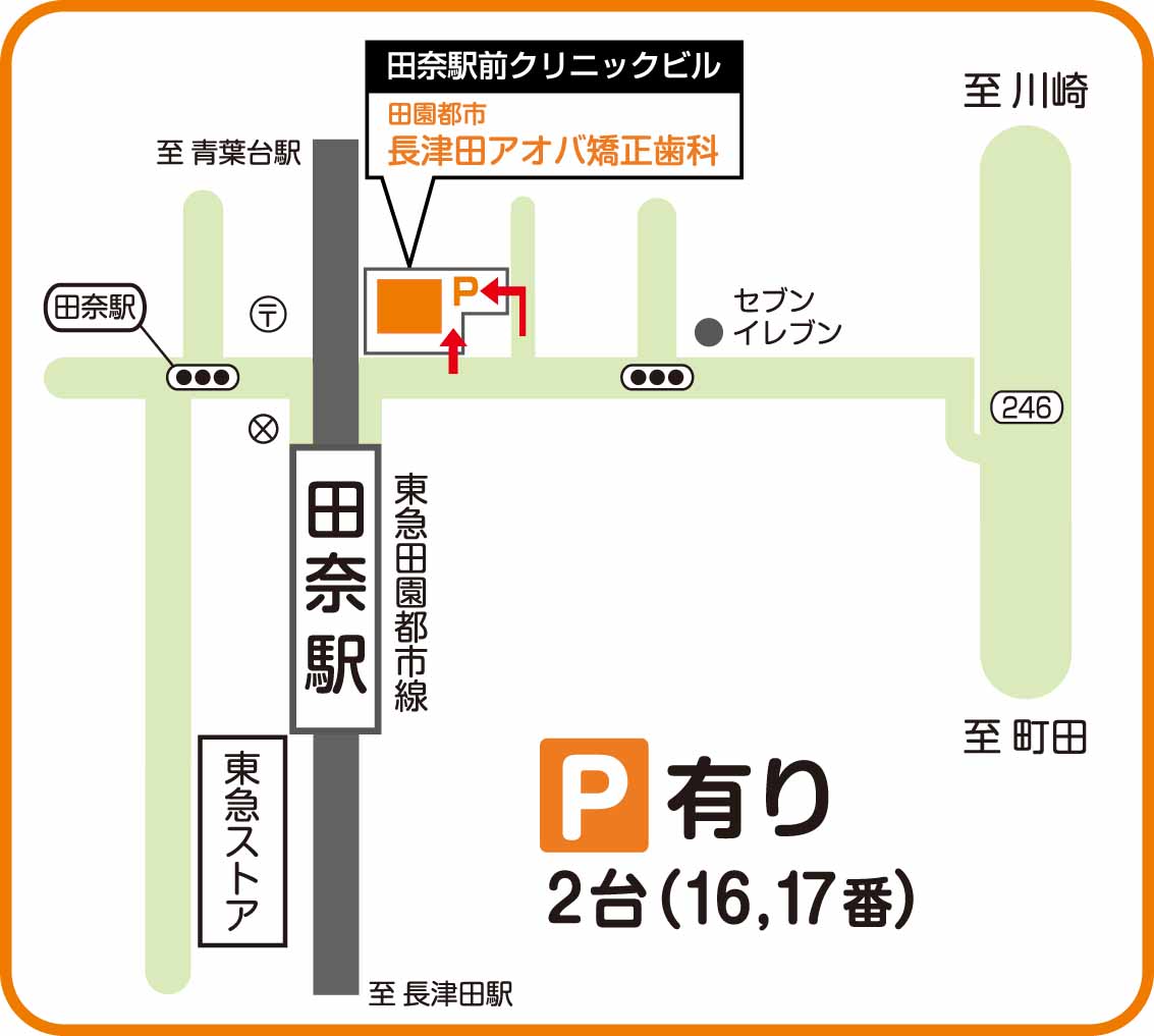 長津田アオバ矯正歯科は東急田園都市線 田奈駅改札口の目の前です。車でのアクセスも抜群で専用駐車場2台分完備しております。