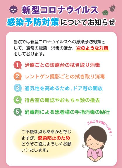 また一人ひとりの治療ごとに診療室の治療用チェアの消毒をしますので少々お時間をいただくことをご了承ください。