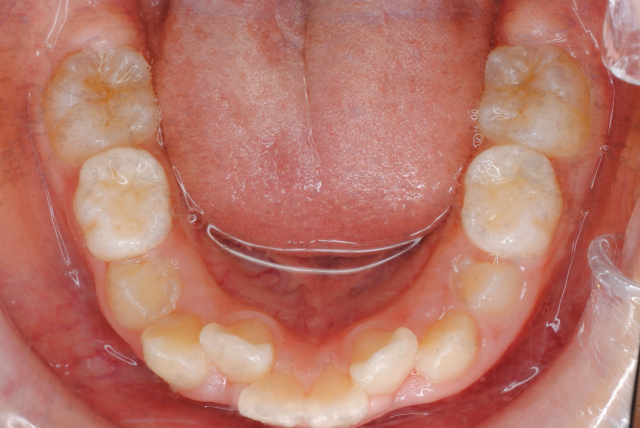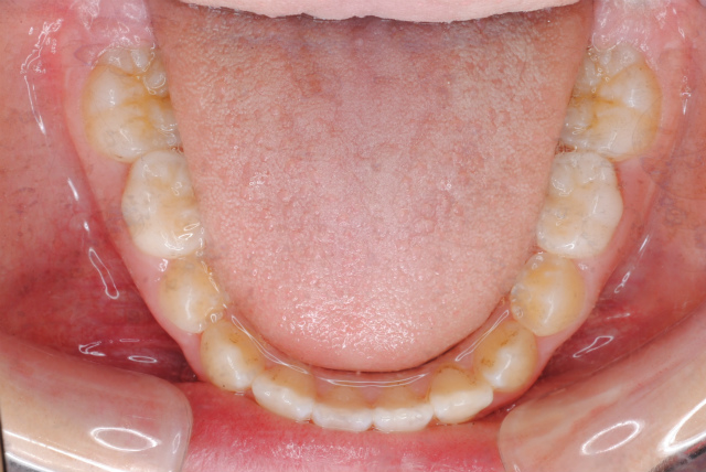 下の写真のように一見歯並びがきれいに並んでいて問題がないように見えますが、舌で前歯を常に押しているから歯並びが整っているに過ぎません。下顎歯列上に舌が覆いかぶさってしまっている様子がおわかりでしょうか。