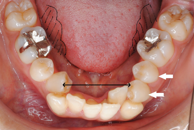 舌体のサイドに歯の痕がくっきりとついている場合は、舌が大きい場合もありますが、下あごの小・大臼歯が内側に倒れて歯列の幅が狭くなっている場合も多いのです。さらには個々の小・大臼歯が上から常に舌に押され続けることで前方に倒されてしまって、前歯にしわ寄せがきて歯並びが乱れることが考えられます。(左下図の白矢印)