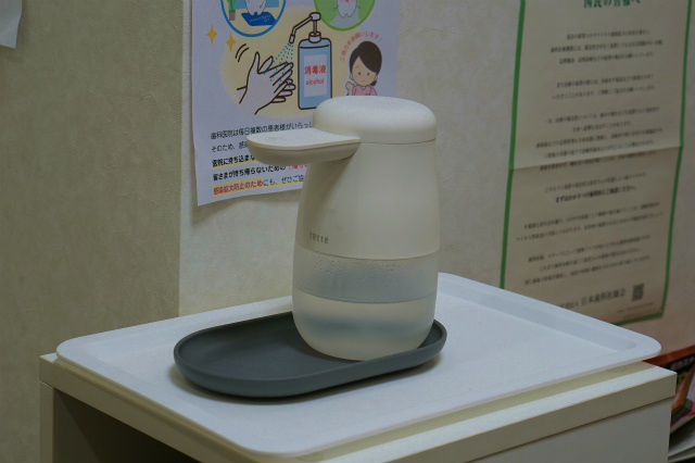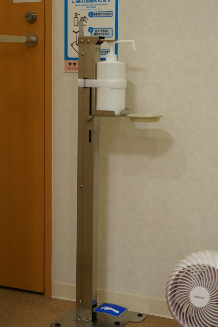当院では入口やお手洗いにプッシュ式の消毒アルコールスプレーボトルを設置しておりましたが、これらを廃して全てセンサー作動と足踏みによる非接触での消毒が可能な自動消毒液噴霧器に交換いたしました。