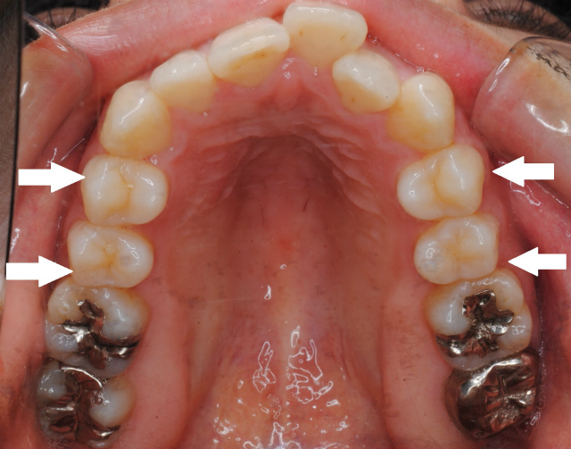⑦ 後方の低位舌だと、舌の側面が臼歯の上に被さって臼歯が内側に倒れてきたり歯が前方へ傾斜する