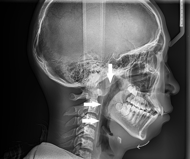 一番上の矢印は咽頭扁桃(アデノイド)が腫れている箇所を示している。下の矢印は口蓋扁桃の腫脹により舌が押されて特に気道が狭くなっている箇所 (10代前半女性)
