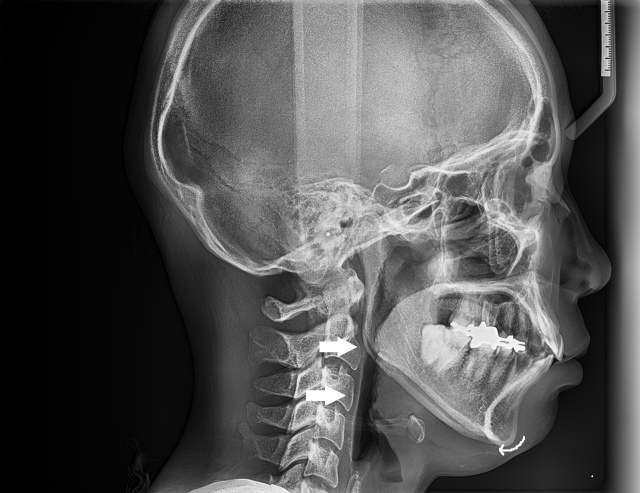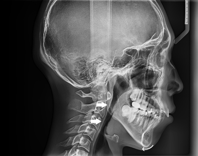 オトガイの矢印は下顎骨の後方回転を示す。気道が全体で狭くなっている (10代半ば男性)