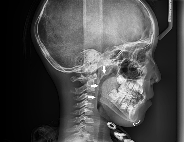 一番上の矢印は咽頭扁桃(アデノイド)が腫れている箇所を示している。気道が全域で狭くなっている (8歳男児)