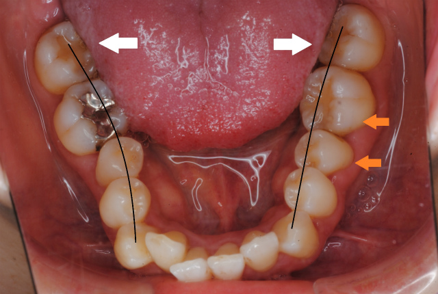 舌の側面が臼歯に被さって歯並びに作用してしまう。左側臼歯が前方に傾斜している様子