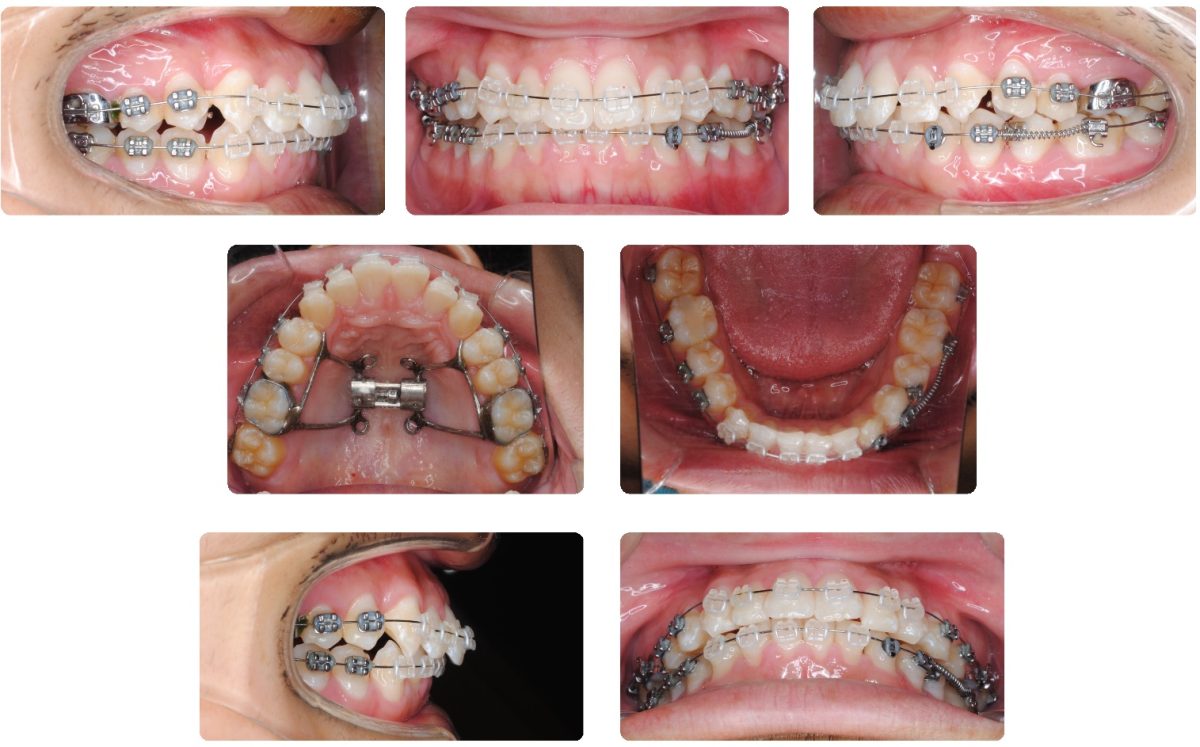 非抜歯で行うには上顎歯列の側方拡大が必要になりますが、実は成人では歯列拡大自体が困難な場合が多いのです。今回は対象年齢が比較的若いこともあり装置には固定式急速拡大装置を選びました。上下顎ともマルチブラケットを装着して同時に上顎の歯列側方拡大をスタートしました。