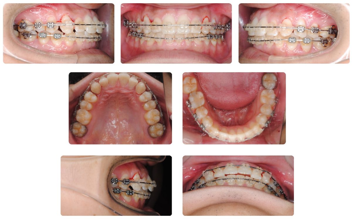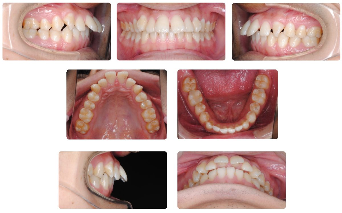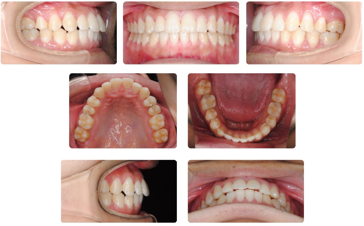 上あご前歯を後ろにひっこめたい、上顎犬歯のねじれを治したいとのことで来院されました。臼歯のかみ合わせは左右差があり若干下顎が右側に偏位しております。当初は小臼歯抜歯も検討したのですが、舌が大きいことから下顎歯列弓を狭くしたくないため、小臼歯非抜歯による治療を行うことにしました。