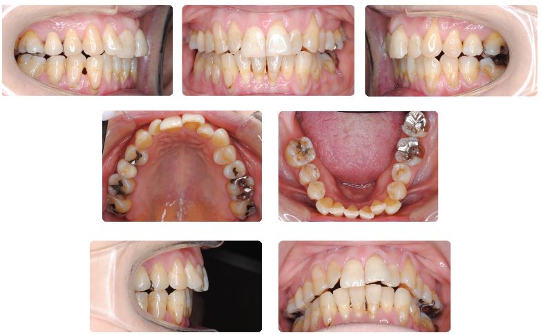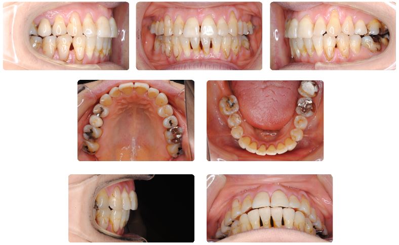 初診時では60代前半で以前はもっときれいに並んでいたとのことですが、歯を支えている歯槽骨の状態の経時的変化もあり上下あごの前歯の重なりがかなり認められる状態でした。