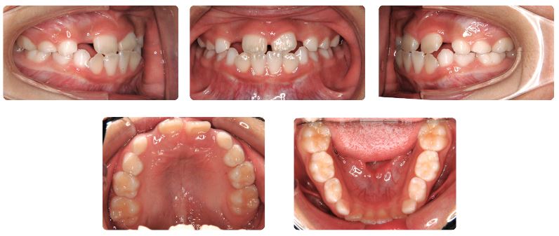 初診時にはすでに下あごが相対的に前方にでており、後に永久歯が生えそろってから前歯以外にも問題のある箇所が生じたケースです。
