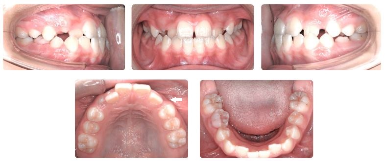 上あごの歯列幅が狭く、矢印で示す箇所のように左側の犬歯の生えるスペースが足りない状態です。