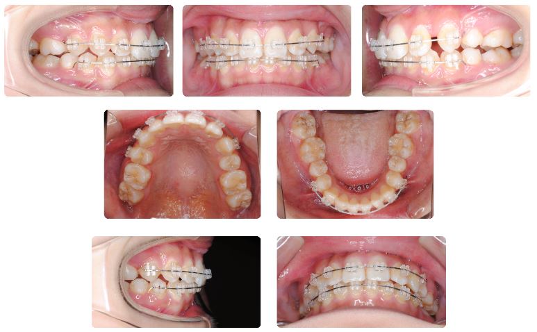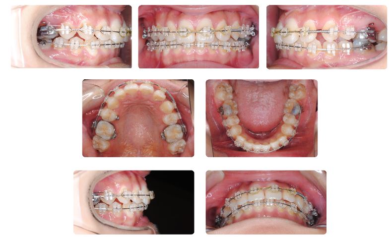 当院で治療を開始するにあたりまず一通りの検査を経てから一部装置の除去と交換を行いました。上の写真は初診時の状態、下の写真は検査後に装置を一部除去してから新しい装置に交換する前の状態です。